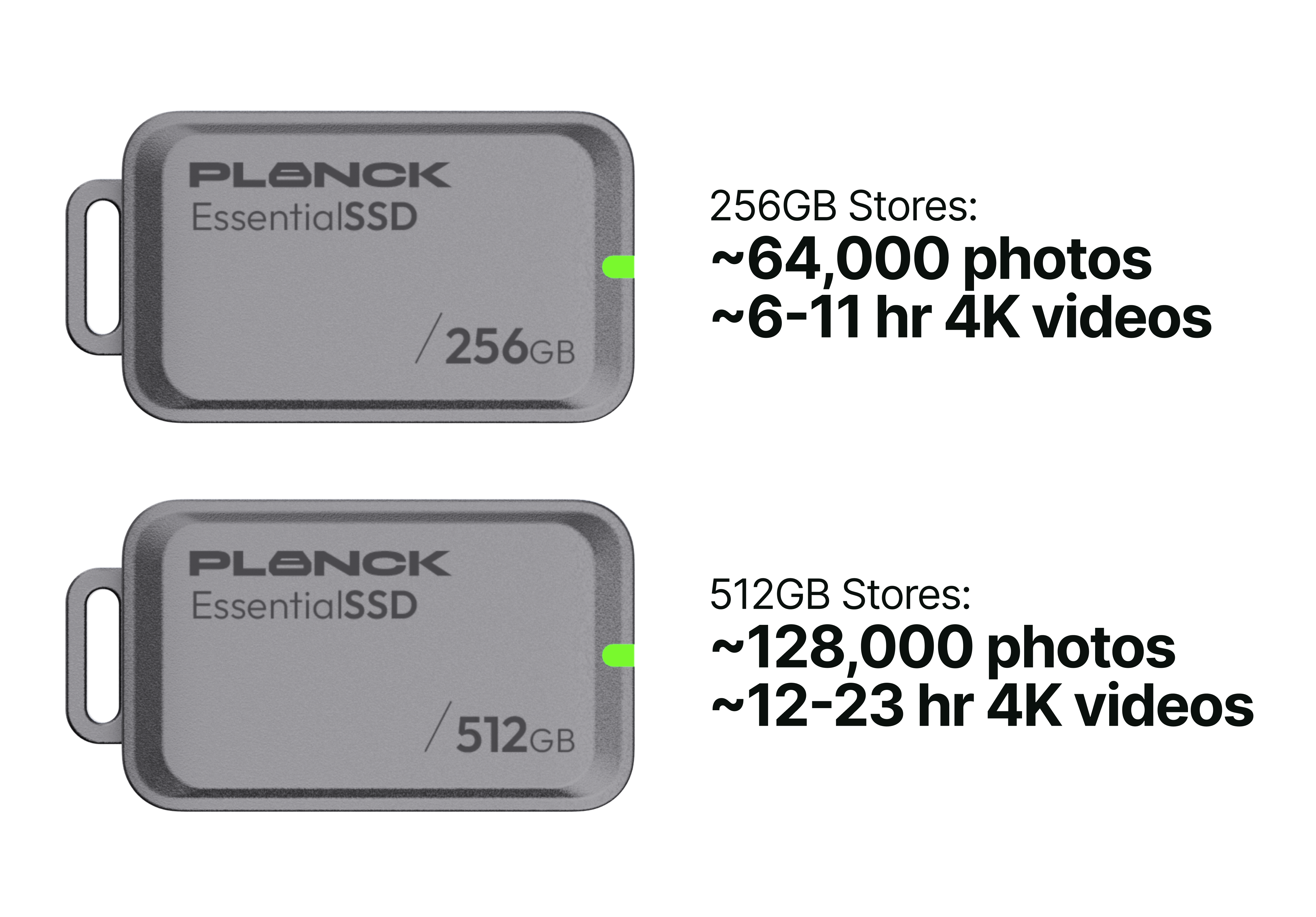 Planck Essential SSD is our ultra-small, plug-and-play “thumbdrive” for phones—made for everyday photo/video offloads and backups. At just 5 g, it offers up to 400 MB/s in 256/512 GB so you can shoot, save, and share across USB-C phones, tablets, and laptops without cables or subscriptions.